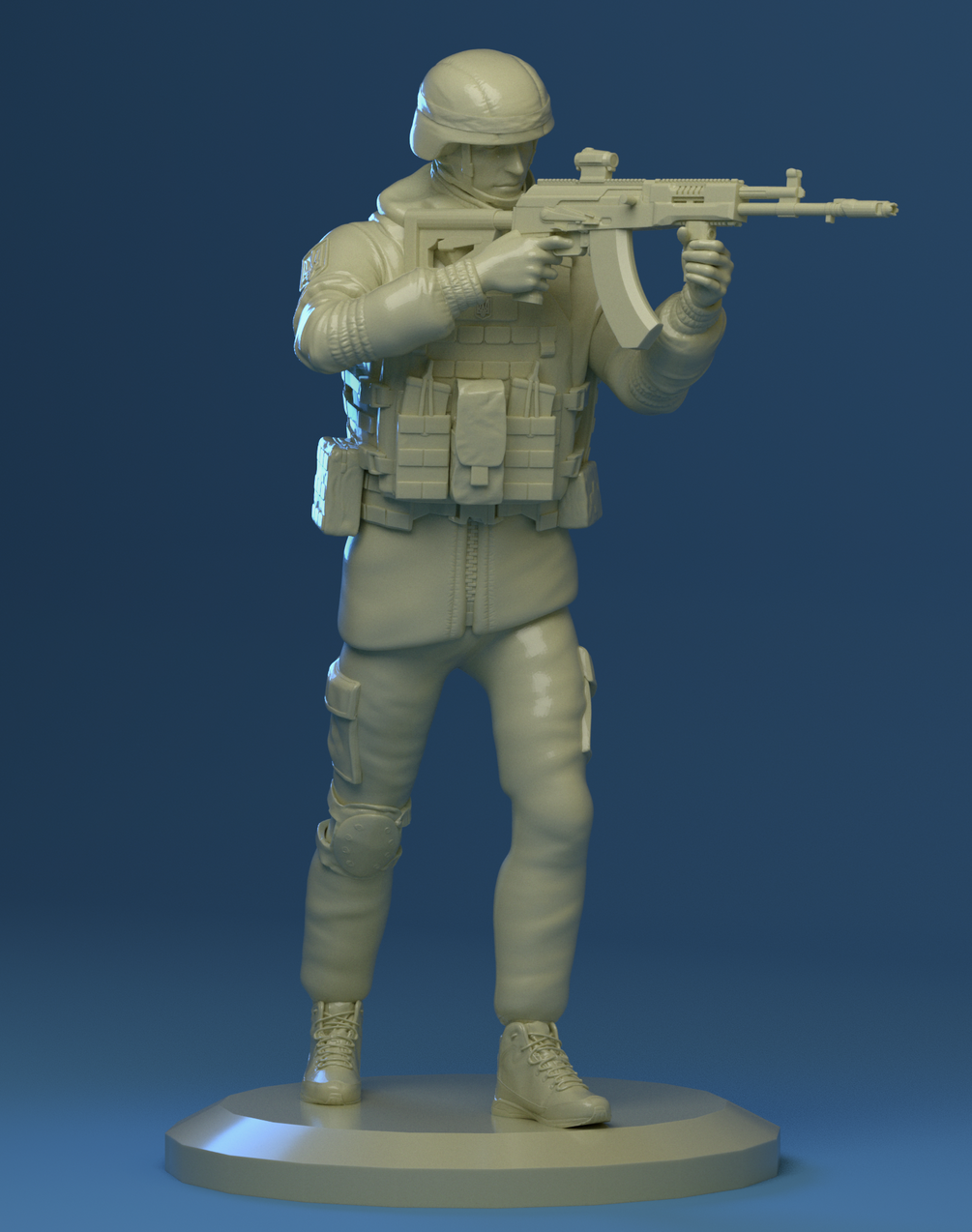 This 3D-printable .STL file represents a Ukrainian special operations soldier (with distinctive trident patch and identifying yellow tape) firing a captured AK-12 rifle, and was designed by Ukrainian sculptor Nikita Klimenko (find him here https://www.artstation.com/gwin and here https://www.instagram.com/gwinpaket/) to raise funds for the defense of Ukraine. The decorative base is separate and shows wreckage from a destroyed "Z" Putinist vehicle and a Ukrainian flag flying above it.